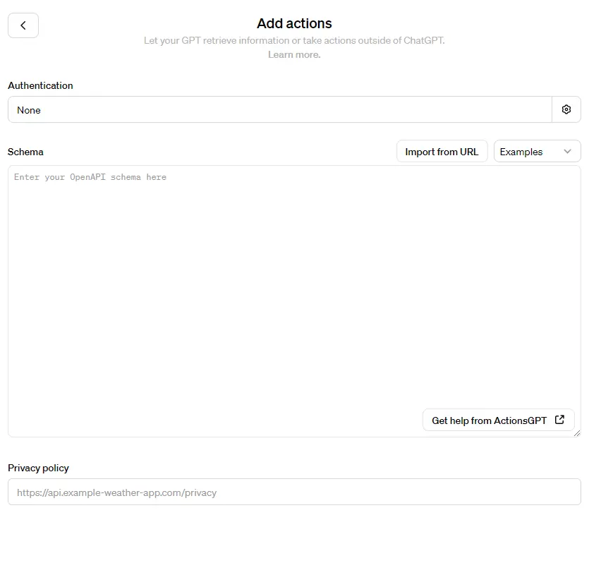 - Privacy policy: GPTsを公開する際のプライバシーポリシーを設定します。