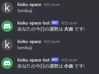 !omikuji と入力すると、以下のようにチャットボットが今日の運勢を占ってくれます。