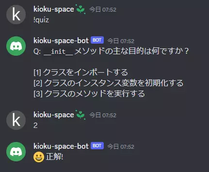 また、!quizと入力したユーザによるメッセージである必要があります。