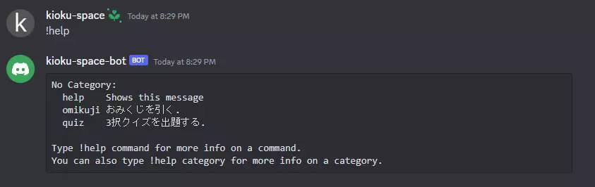 また、!helpコマンドでコマンド一覧が表示されます。