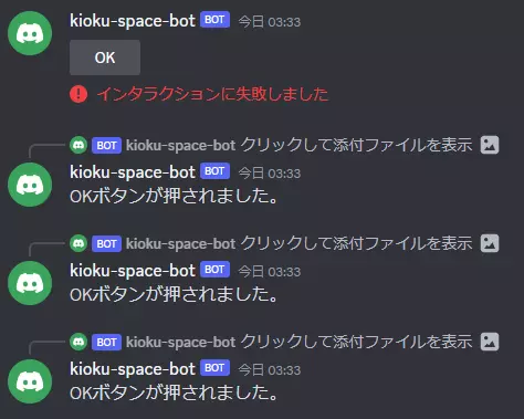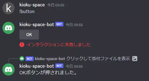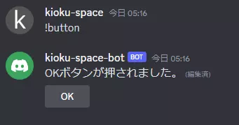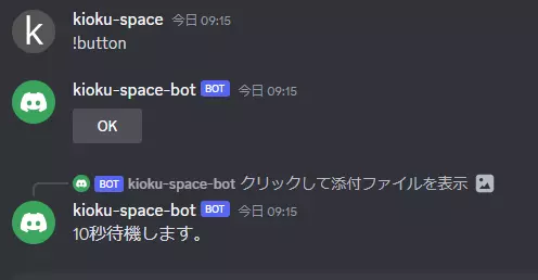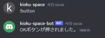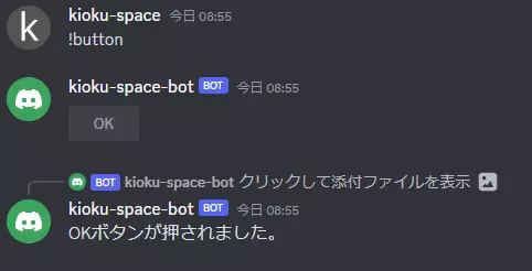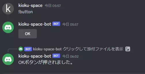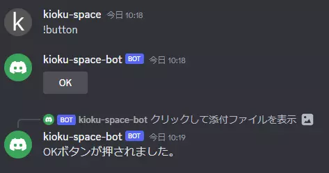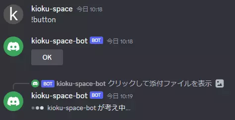 上記のように設定後チャットボットを起動し、!buttonコマンドを実行してみましょう。