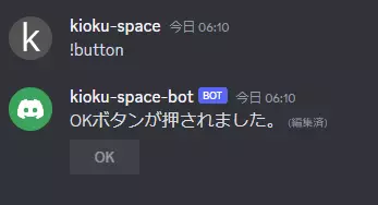 commands/button.pyfrom discord.ext import commands from discord import ui @commands.command(name='button') async def button_command(ctx: commands.Context): """ボタン付きメッセージを表示する.""" view = ui.View() # Viewインスタンスを作成 button = ui.Button(label='OK') # Buttonインスタンスを作成 view.add_item(button) # ViewにButtonを追加 await ctx.send(view=view) # Viewを追加したメッセージを送信 -